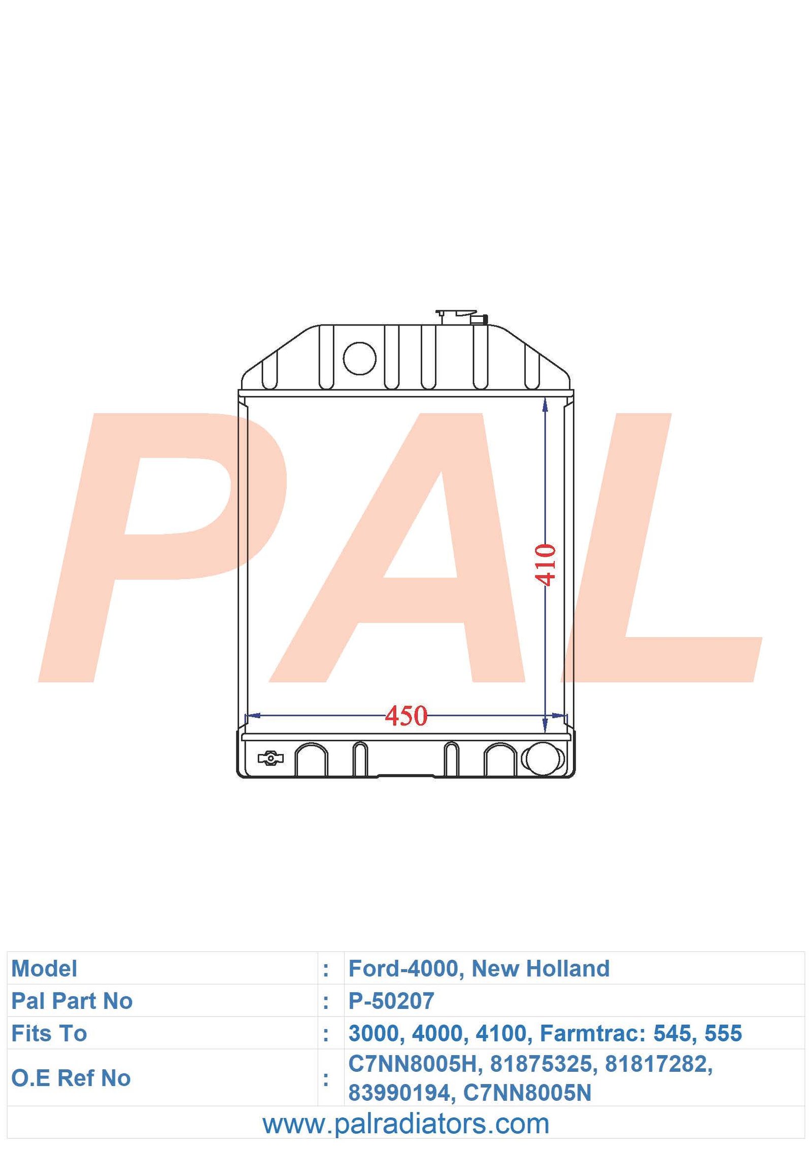 Model: Ford-4000 , New Holland, Farmtrac PART NO: P-50207 FIT TO: 2000, 2100, 2120, 2300, 230A, 231, 2310, 233, 234, 2600, 2610, 2810, 2910, 3000, 3100, 333, 334, 335, 340, 3400, 340A, 3500, 3550, 3600, 3610, 3900, 3910, 4000, 4000SU, 4100, 4110, 4140, 420, 4400, 44 O.E REF NO: C7NN8005H,81875325,81817282,83990194, C7NN8005N BRAND: FORD