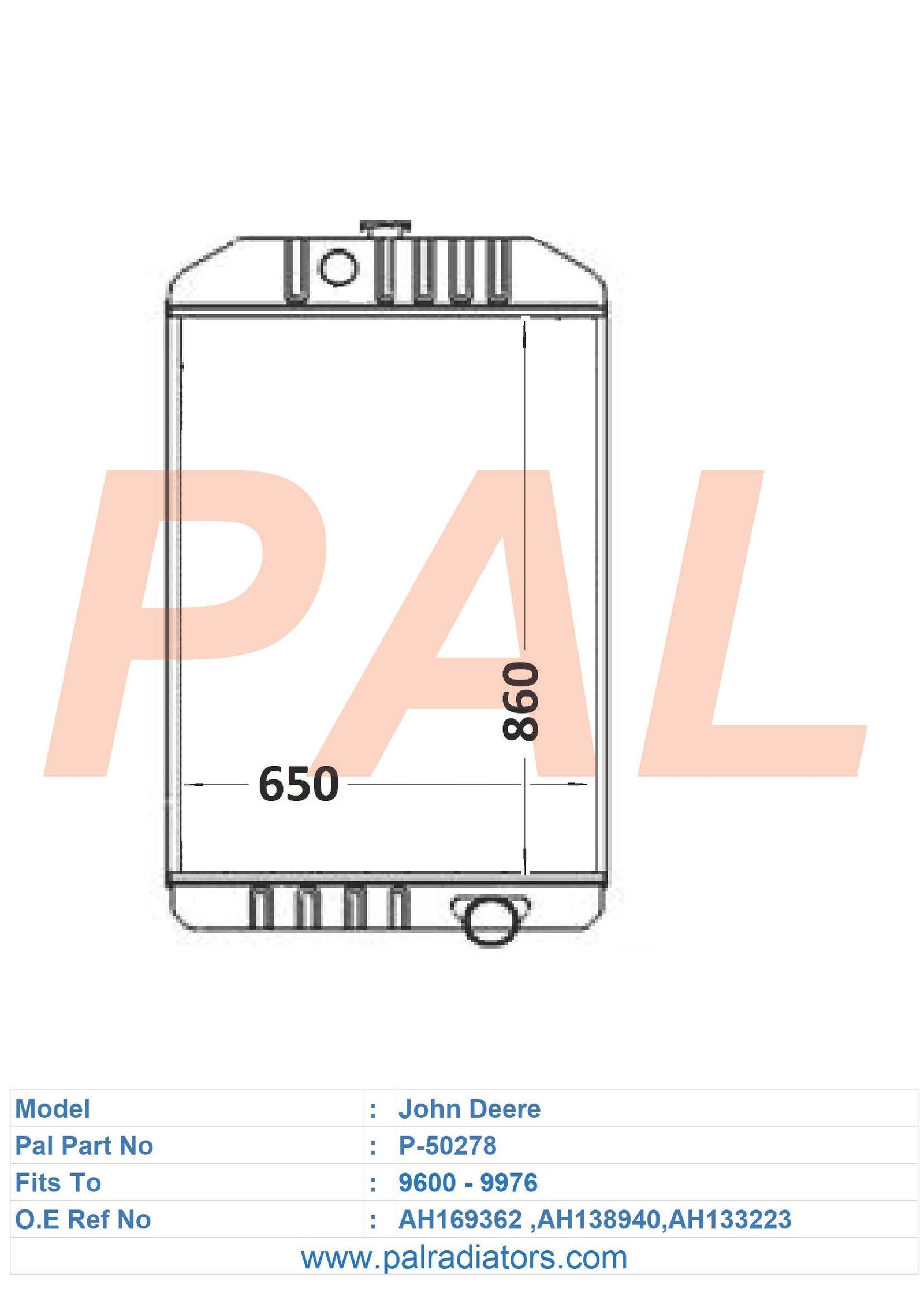 Model: John Deere PART NO: P-50278 FIT TO: 9600 - 9976 O.E REF NO: AH169362 ,AH138940,AH133223 BRAND: JOHN DEERE